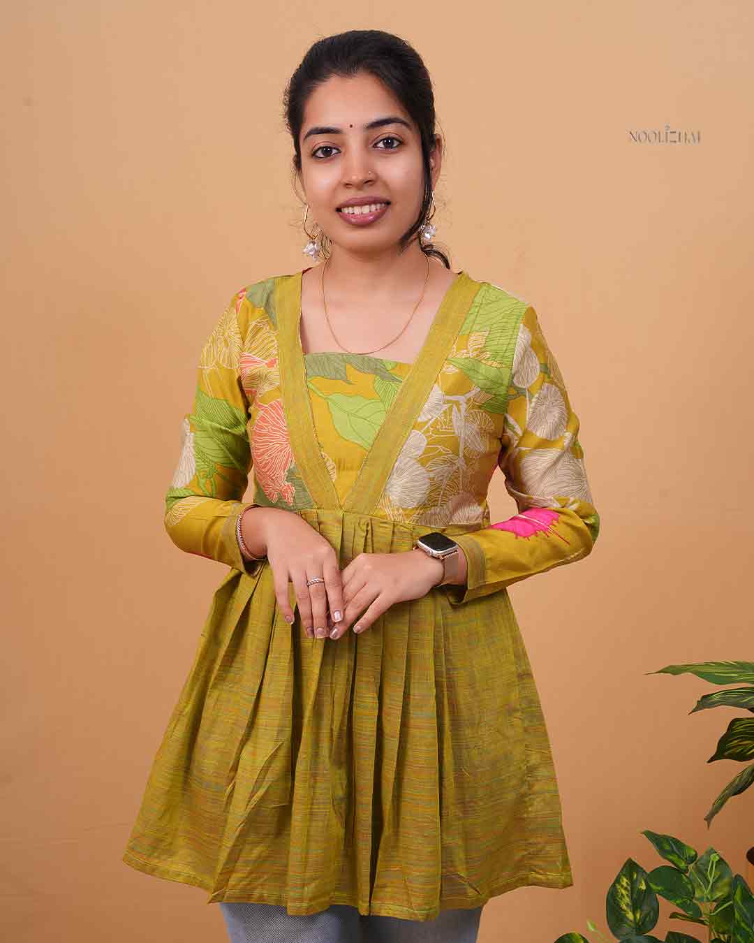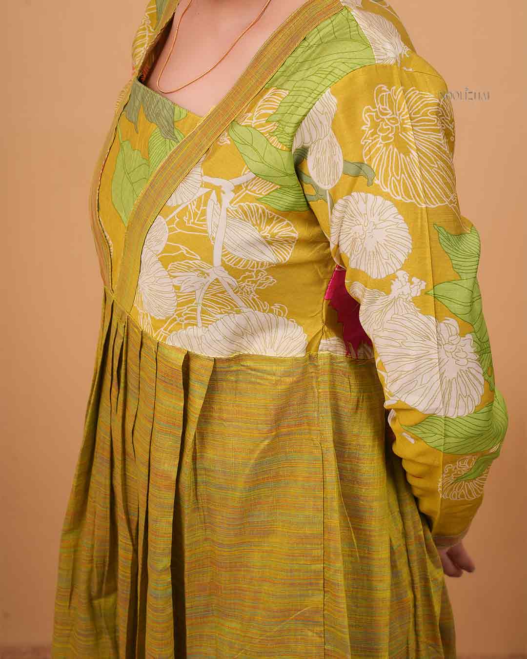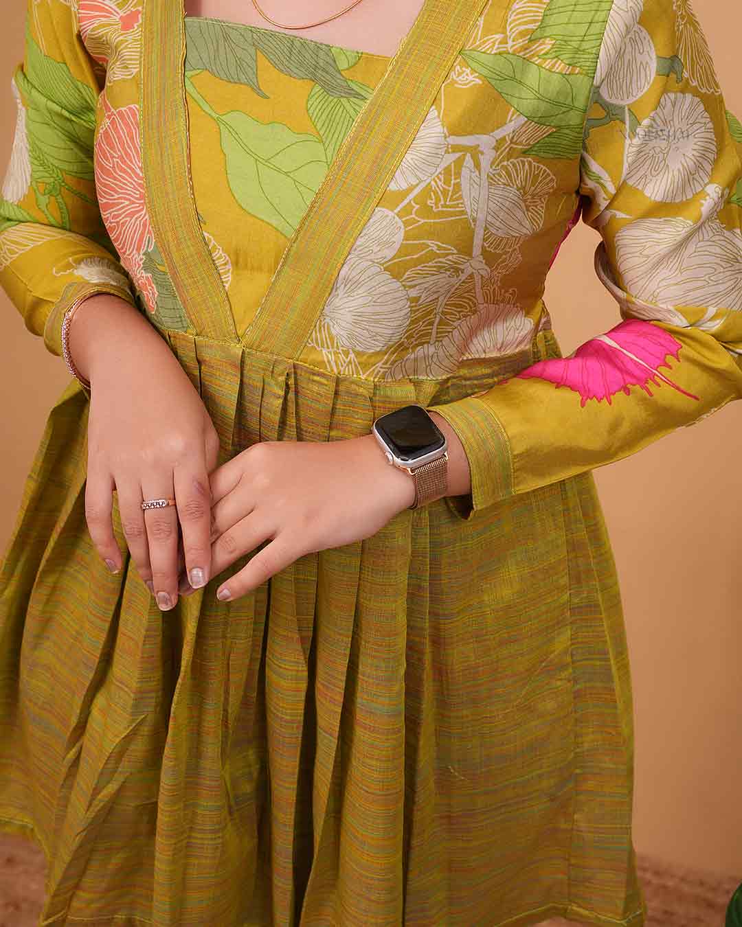 This elegant olive-green kurti dress features a refreshing floral print with a flattering empire waist that flows into soft pleats. Designed with a V-neck layered look and full sleeves, it blends comfort with everyday sophistication. The lightweight fabric makes it perfect for casual outings, office wear, or relaxed festive days when you want effortless style with a graceful touch.